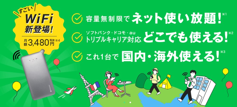 どんなときもWi-Fiの詳細。3キャリアLTE対応、データ使い放題、月額3,480円。凄すぎ!