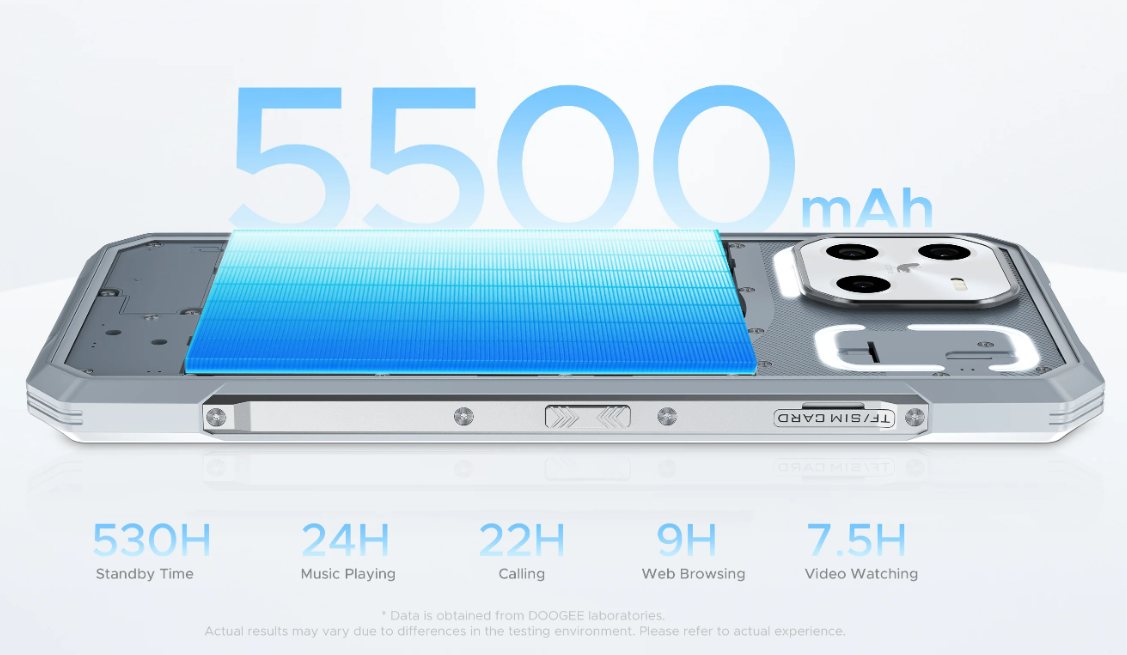 バッテリー容量は5,500mAhとタフネススマホとしては少なめ。薄型軽量設計の弊害ともいえます。