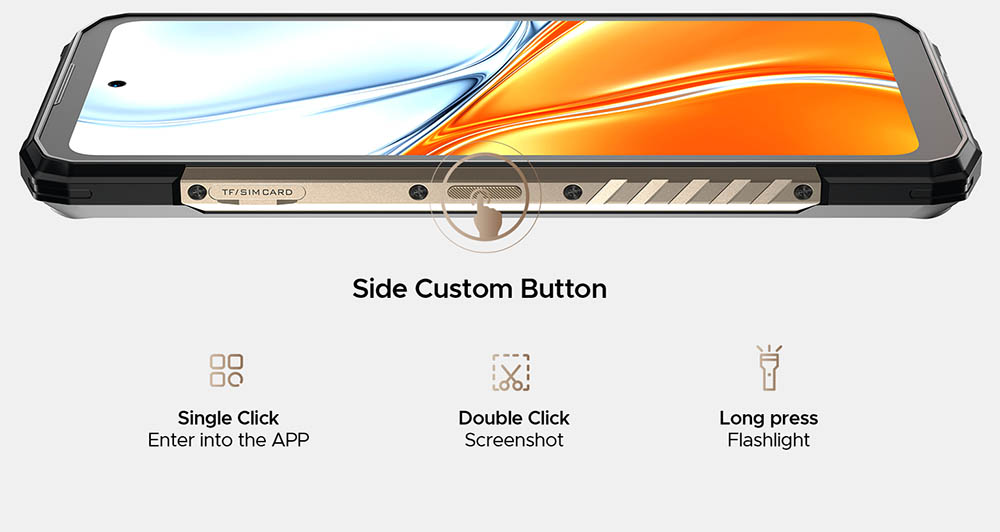 ▼左側面にはカスタムボタンを搭載。アプリの起動、スクリーンショット、懐中電灯の起動などができます。複数動作対応しているのはいいですね!↓