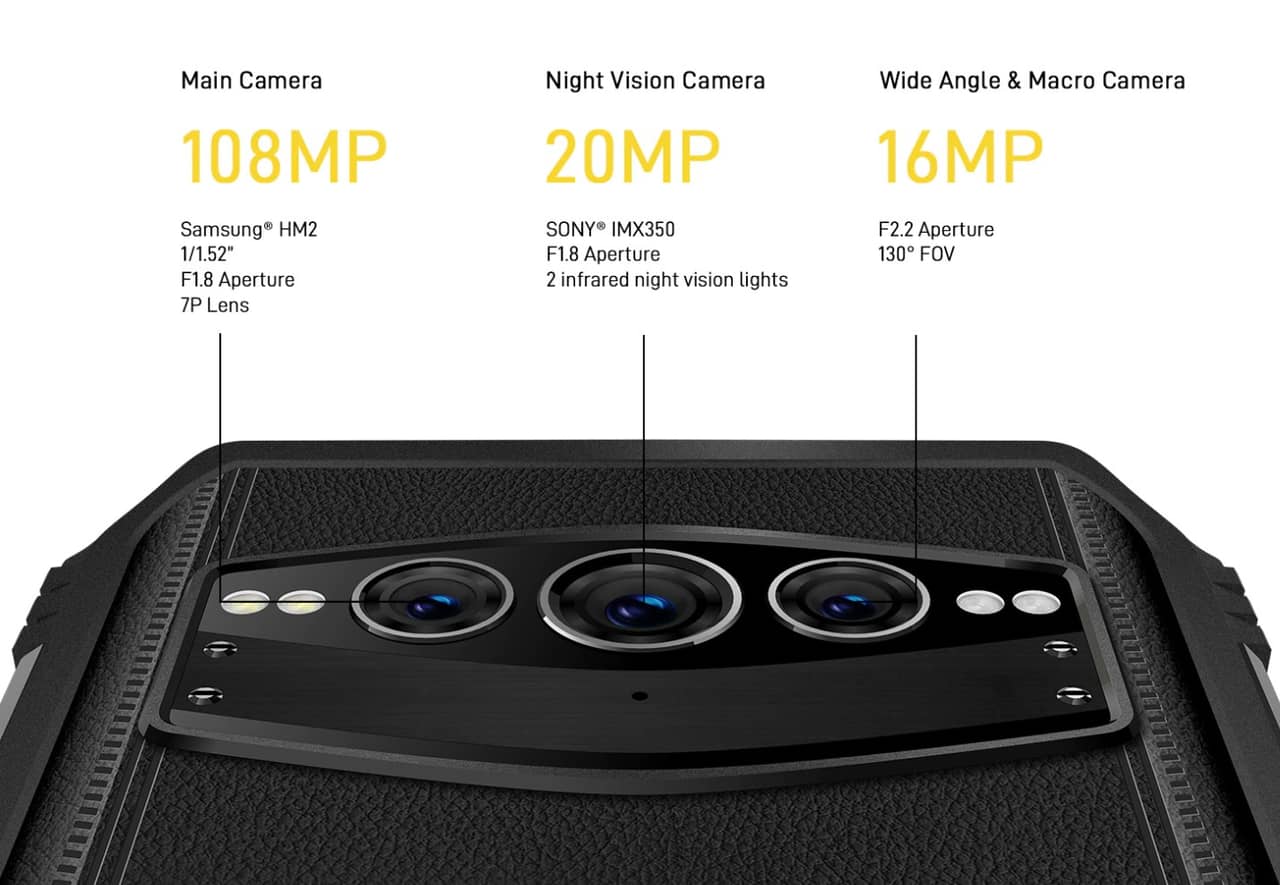 DOOGEE S100の背面カメラは広角のメインカメラ(1億800万画素)、ワイド画角の超広角兼マクロカメラ(1,600万画素)、ナイトビジョンカメラ(2,000万画素)の3眼構成です。