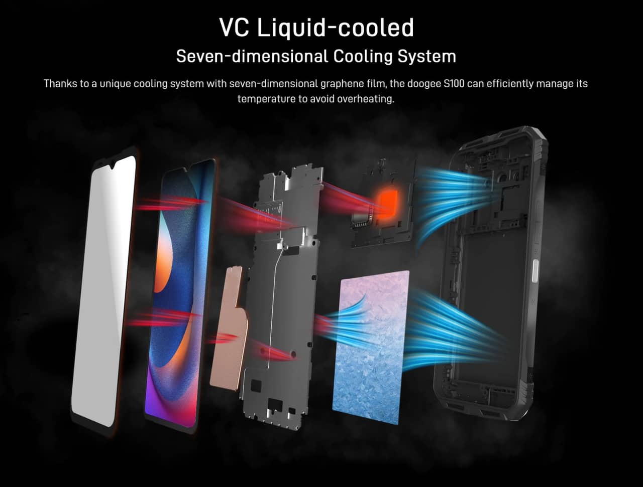 ▼またタフネススマホは設計上熱がこもりやすいのが欠点ですが、DOOGEE S100はそれを補うために冷却パネルを搭載しているのも特徴!これもタフネスモデルでは珍しいですね。チップ、バッテリーの熱による劣化も抑えられるのは嬉しい。↓