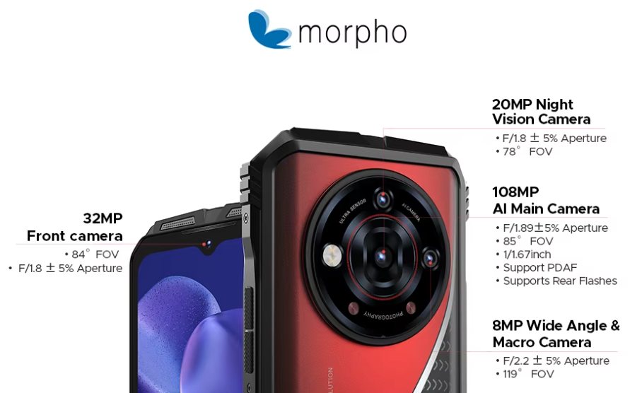 カメラ構成は1億画素メイン、800万画素の超広角と2,000万画素のマクロというタイプ!タフネスならではなナイトビジョンカメラは完全暗所でも撮影、視認が可能で、野外で暗闇を歩く時から暗所での作業とか記録撮影に適したものとなります。