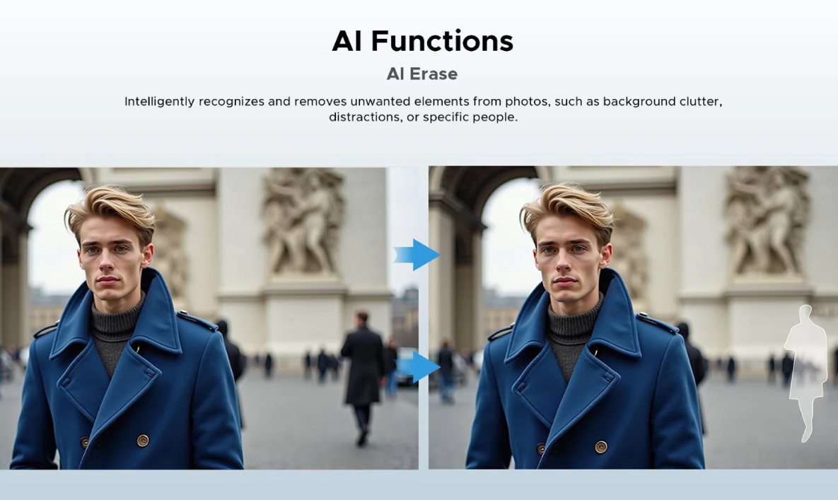 他のタフネスと違って本機はAI機能にも注力しているようです。たとえば背景の被写体を消去する消しゴムマジックみたいな機能だったり。