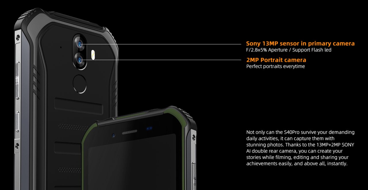 DOOGEE S40 Proのリアカメラは広角のメインカメラ(1,300万画素)、深度測定用のマクロカメラ(200万画素)の2眼構成です。