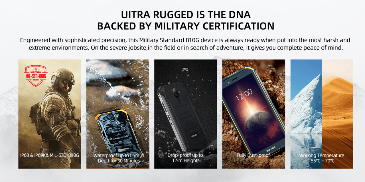 DOOGEE S40 Proは一般的なスマホよりもはるかに耐久性が高く、水没でも砂に埋まっても1.5mから落としても、高温、低温といった過酷な状況であってもしっかり動作する耐久性の高さを誇ります。サバイバル、アウトドアといったシーンで安心して使えるのが魅力。