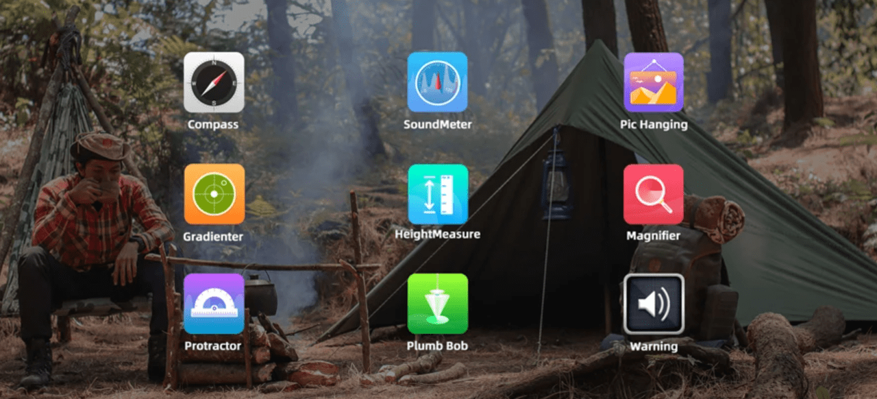 またコンパス、高度計、水平器などの各種ツールボックスアプリも収録。アウトドアもDIYシーンにおいても役立ちます。これらの機能も上の独自キーからアクセス可能!