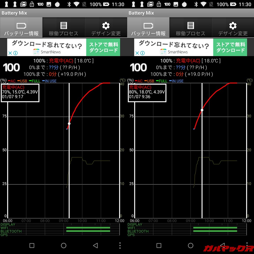 ▼バッテリーの充電ですが付属の充電器とケーブルを利用して充電しています。70%から80%まで10%を充電するのにかかった時間は19分。1時間で約30%充電出来る計算です。バッテリー容量が5500mAhと大容量なので充電時間はそれなりに必要ですが、充電速度が早いので一般的なスマホと変わらない時間で大容量バッテリーの充電が可能となっています。↓