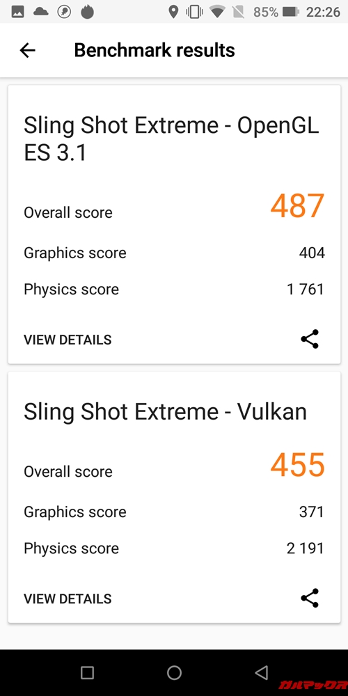 ▼DOOGEE S70の3DMarkスコアはOpenGL ES 3.1が487点、Vulkanが455点でした!↓
