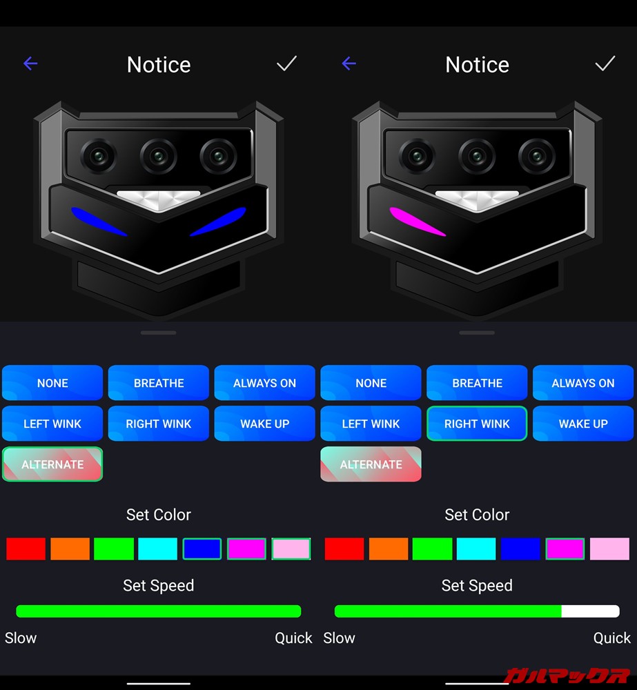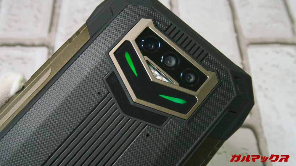 ▼カメラの下には背面LEDでヒーローや悪役キャラみたいな鋭い眼が浮かんできます。カッコいいし結構目立つ!友達と喋るときもちょっとした話のタネになりますね。↓