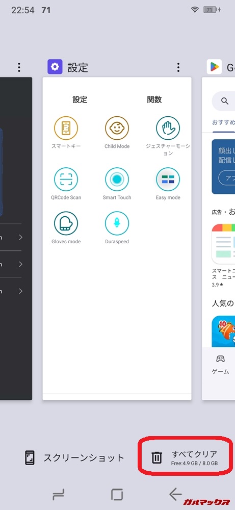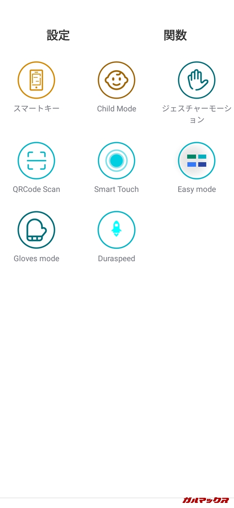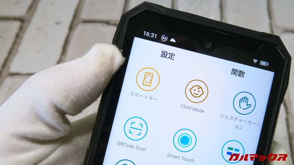 ▼設定アプリの関数タブ内には独自機能もいくつかありました。「任意の位置に戻る・ホームなどの操作ができるボタンを置けるスマートタッチ」「タッチ感度を上げるグローブモード」「様々なジェスチャー操作ができるジェスチャーモード」などなど…↓