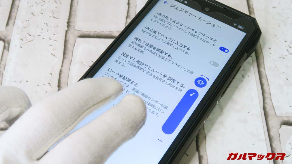 ▼特に面白いのがジェスチャーモーション。3本指のスワイプダウンでスクショができたり、2本指で同時に上下スワイプすると音量を変えられるって機能です。音量は即座に最大/消音レベルまで調節できるメリットはあるけど使い所は見出しにくい。↓