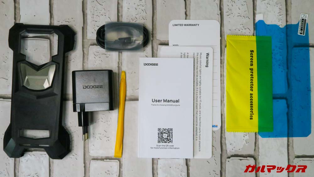 ▼付属品はこんな感じでした!保護フィルムも付属しているのはありがたい!あと充電器プラグが海外仕様なのでプラグ変換アダプタは買っておきましょう!↓