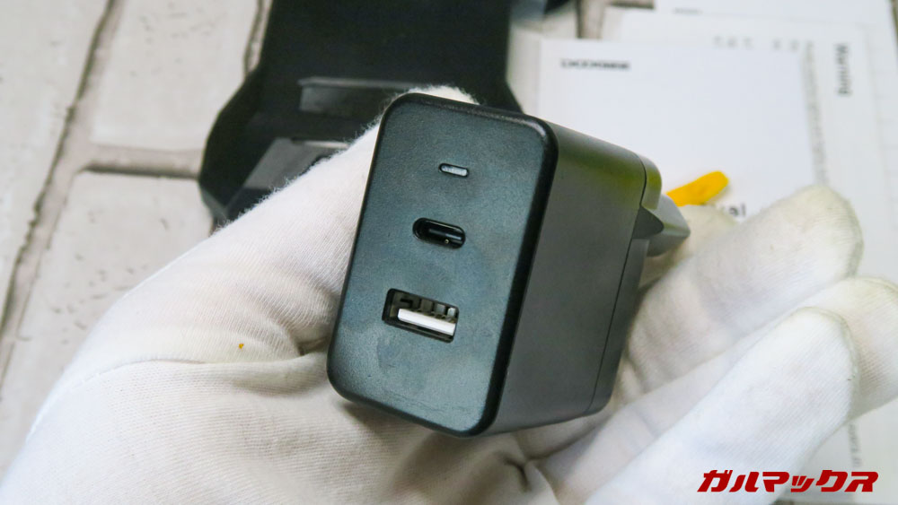 ▼充電器はなんと2口タイプ!1つがType-Cでもう1つはUSB-A端子なので、同時に2つに給電できるというナイスすぎる仕様。あと通電すると青いLEDランプが点灯します。規格はType-Cが65W、USB-Aが18Wまで。↓