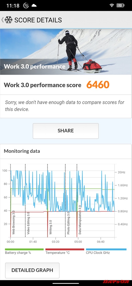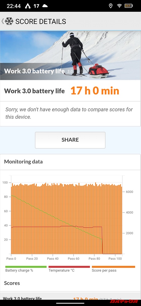 ▼それゆえに電池持ちは極めて良く、SNS、WEB、動画閲覧と筆者なりにそこそこ使っていても1日は余裕で持ちます。PCMarkのBattery Life測定も17時間と、平均8~9時間だった他スマホを凌駕しています。↓