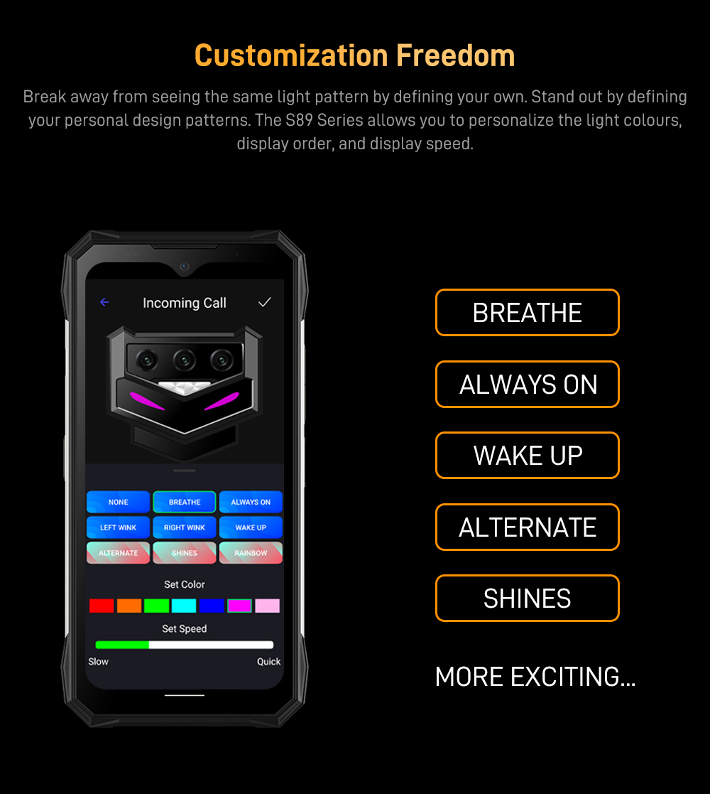 ▼DOOGEE S89はヒロイックなデザインでかなりガッチリしたスタイルとなっています。カラーはブラックとイエローで、アクセントカラーのみが変わるタイプです。↓