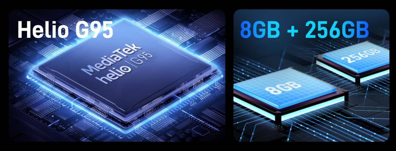 ▼SoCはミドルレンジ性能を持つHelio G95を採用!さらにメモリ(RAM)は8GBとハイエンドレベルに大きいため、動作はかなり安定しそう!保存容量(ROM)が256GBとデカいのでたっぷり写真や動画、アプリを詰め込めるのも魅力!↓
