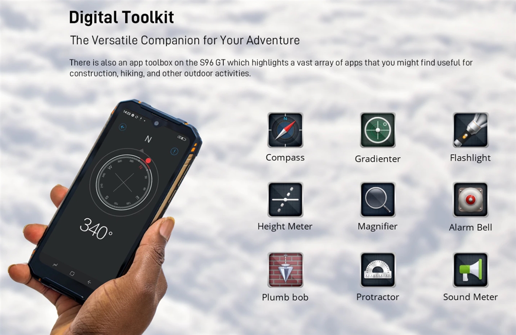 ▼タフネススマホ特有のツールボックスにも対応しており、コンパスから分度器、音量測定なども使うことができるようになっています。作業時にも役立ちそう。↓