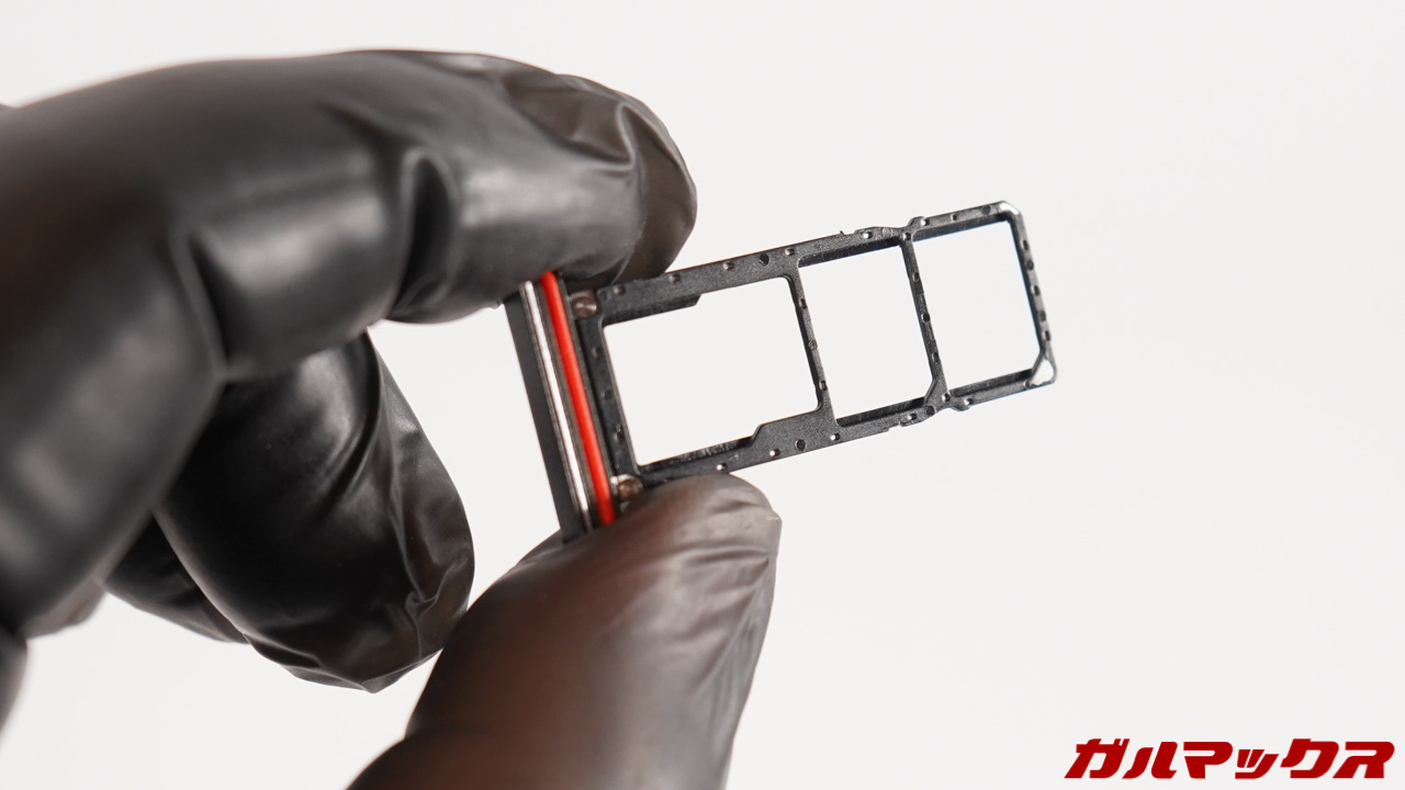 ▼ちなみにSIMトレイはトリプルタイプ。2回線同時待ち受けを使いながらMicroSDで容量を拡張できるようになってました!ただし、内部ストレージとしては使えません。↓