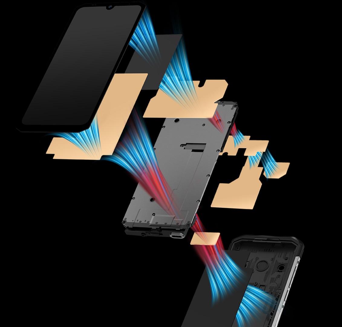 ▼またタフネススマホは防護パネルで覆う設計上ブ厚くなり放熱性が低い欠点があるんですが、DOOGEE S99はそれを克服するべく内部に放熱パネルを搭載!これによりカメラの長時間撮影や高温下での使用といった酷使をしても発熱を抑制できるようになっています。↓