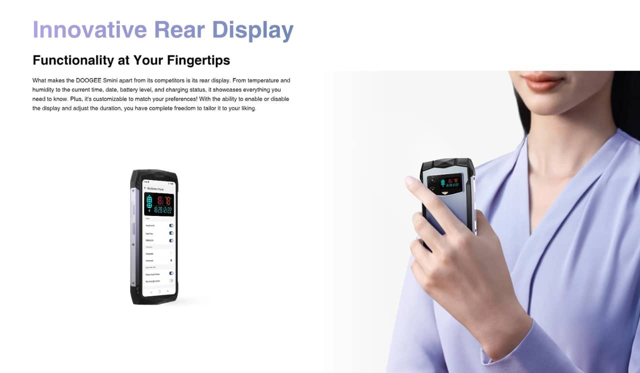 DOOGEE Sminiの特徴やスペック、対応バンドをまとめたのでチェックしてみて下さい。背面にディスプレイを搭載した4.5型のHelio G99搭載タフネススマホです。