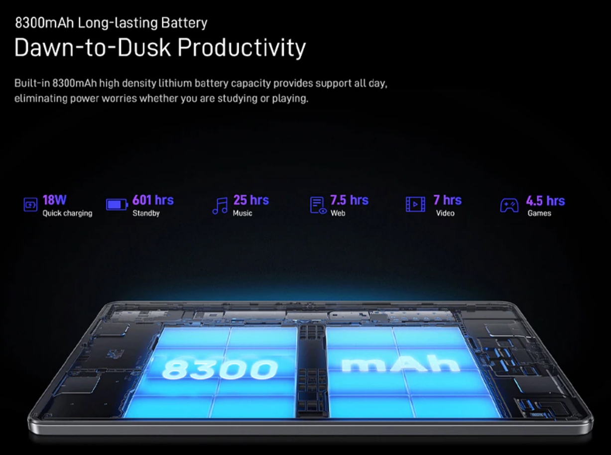 ▼バッテリー容量は8,300mAhとなっており大容量!スタンバイで601時間ももち、動画視聴では最長7時間も連続して動く電池持ちの良さです。急速充電も18Wに対応しているのもGood。↓
