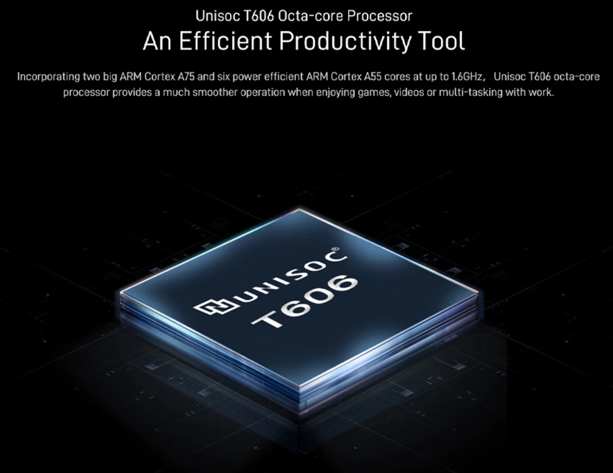 ▼SoCはUNISOC T606を採用!普段使い向けのミドルレンジスペック。しかしメモリ(RAM)は標準で8GBと大容量で、さらに最大7GBのRAMブーストにも対応しているので安定性はかなり期待できそうです!↓
