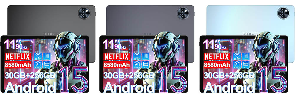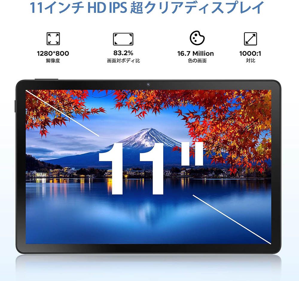 ▼11インチの大型タブレットで、カラーはブラック、グレー、ブルーの3色展開となっています。。↓