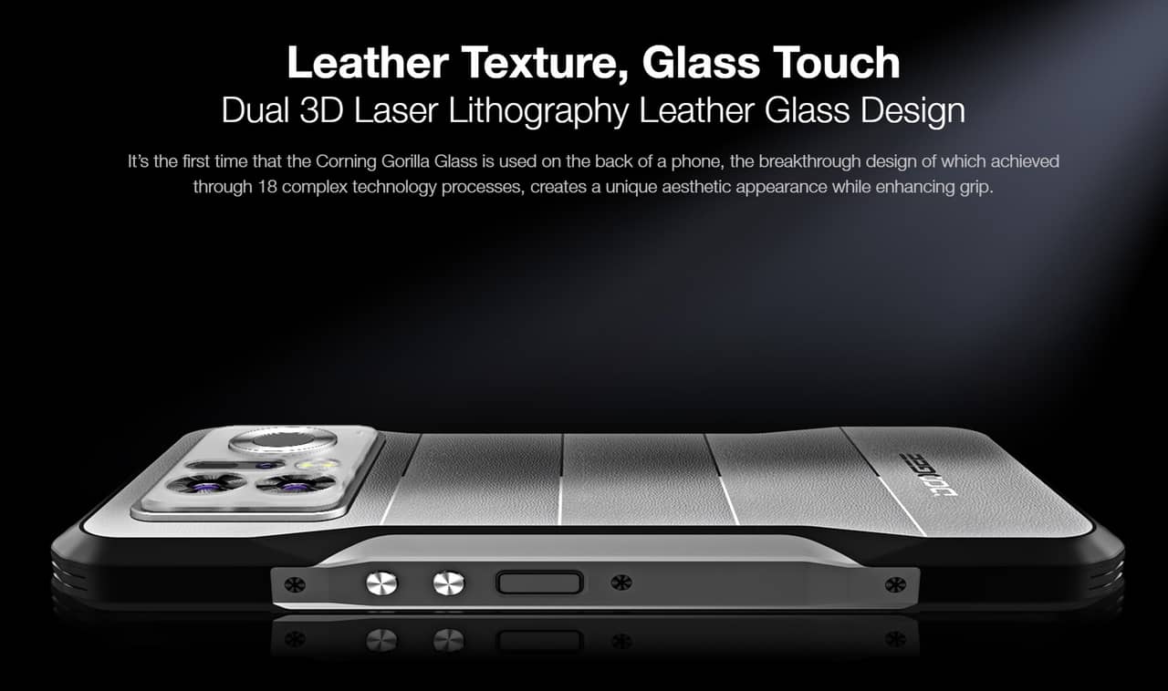 ▼タフネススマホの背面パネルってだいたい樹脂製なんだけどDOOGEE V20 Proはなんとガラス製パネルを採用!マジかよ!しかもレザー調のテクスチャ模様をあしらっており、見た目はかなりゴージャスって感じ。触ってみたい。↓