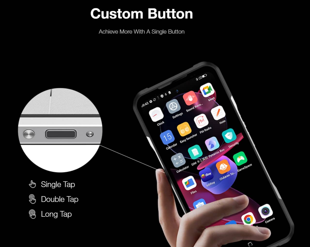 ▼電源キーとは反対側にカスタム可能なマルチファンクションキーも搭載!1回押し、2回押しそして長押しでショートカット機能を使えるようになっています。これもタフネススマホの醍醐味の1つですね。↓