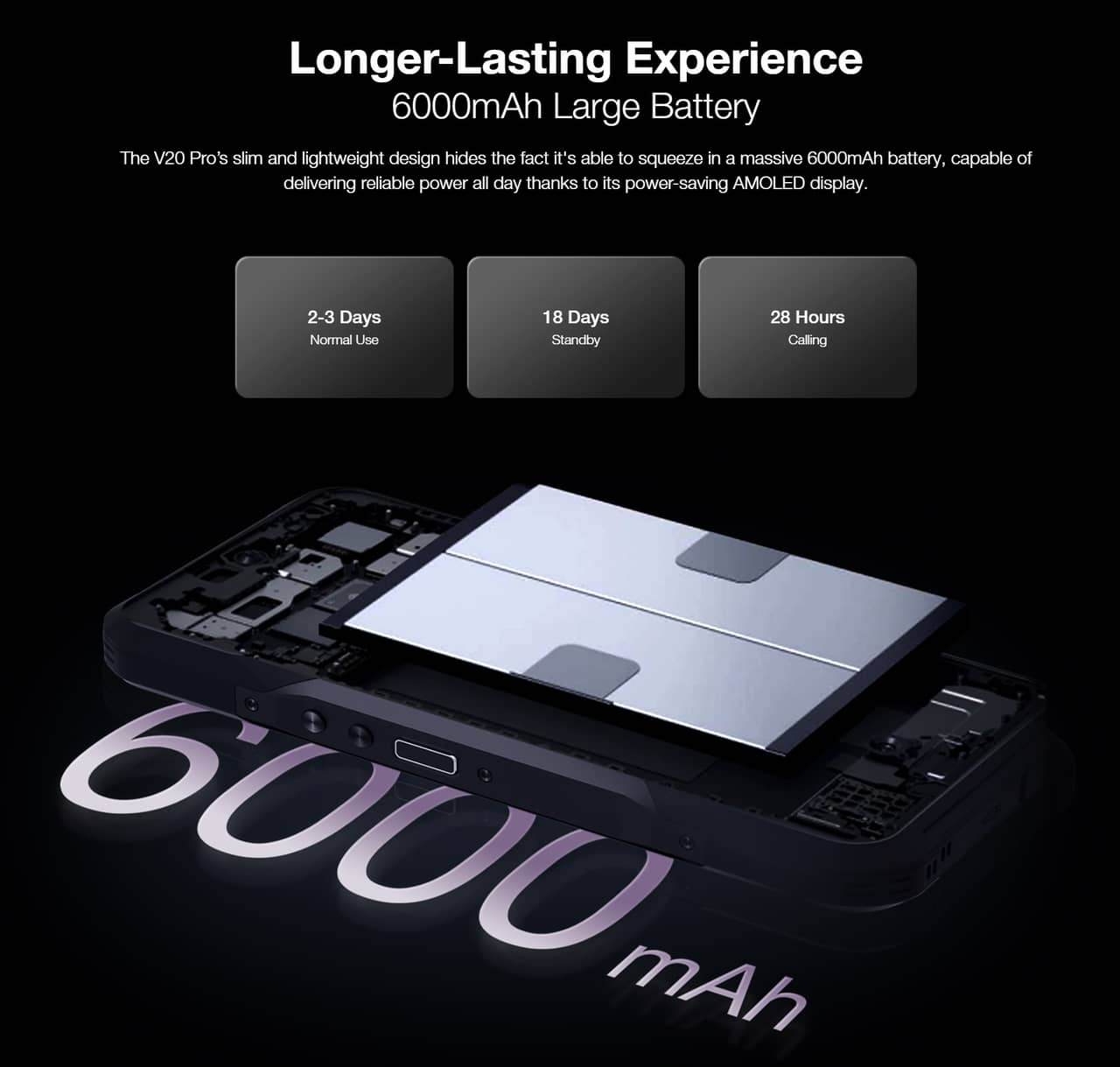 - 6,000mAhの大容量バッテリー、通常使用で2~3日の電池持ち