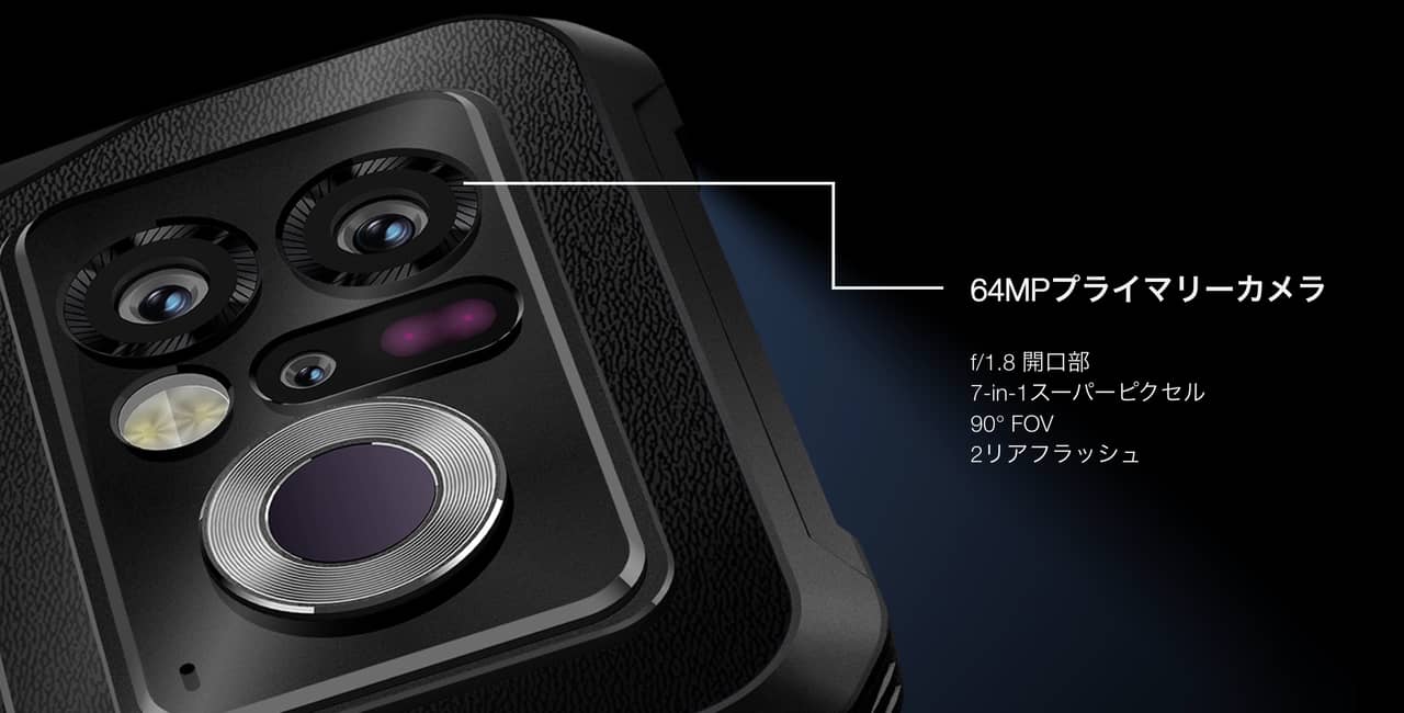 DOOGEE V20 Proの背面カメラは広角のメインカメラ(6,400万画素)、ナイトビジョンカメラ(2,400万画素)、サーマルカメラ、補助カメラ(800万画素)の4眼構成です。