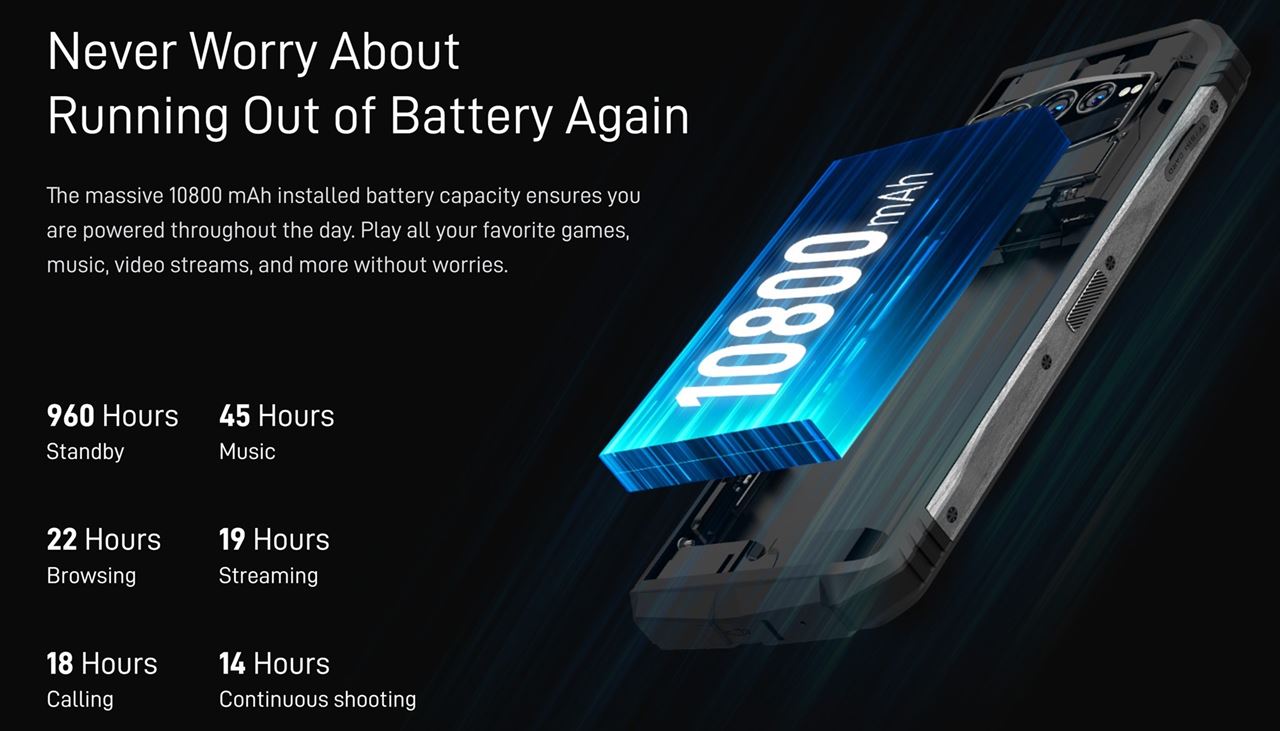 ▼バッテリー容量は10,800mAhとものすごい大容量で普通のスマホの2倍の大きさ!↓