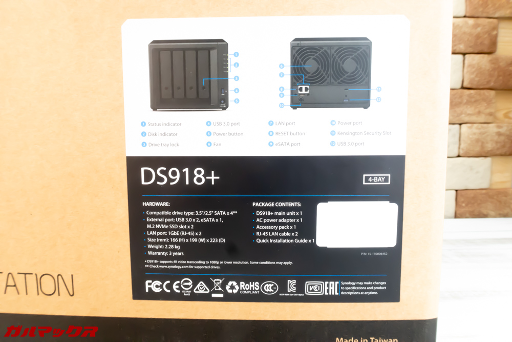 ▼DS918+は同社のNASシステムの中でも比較的ハイエンドな部類のモデルで4ベイ仕様なので筐体は大きめ。梱包箱もデカイ。↓