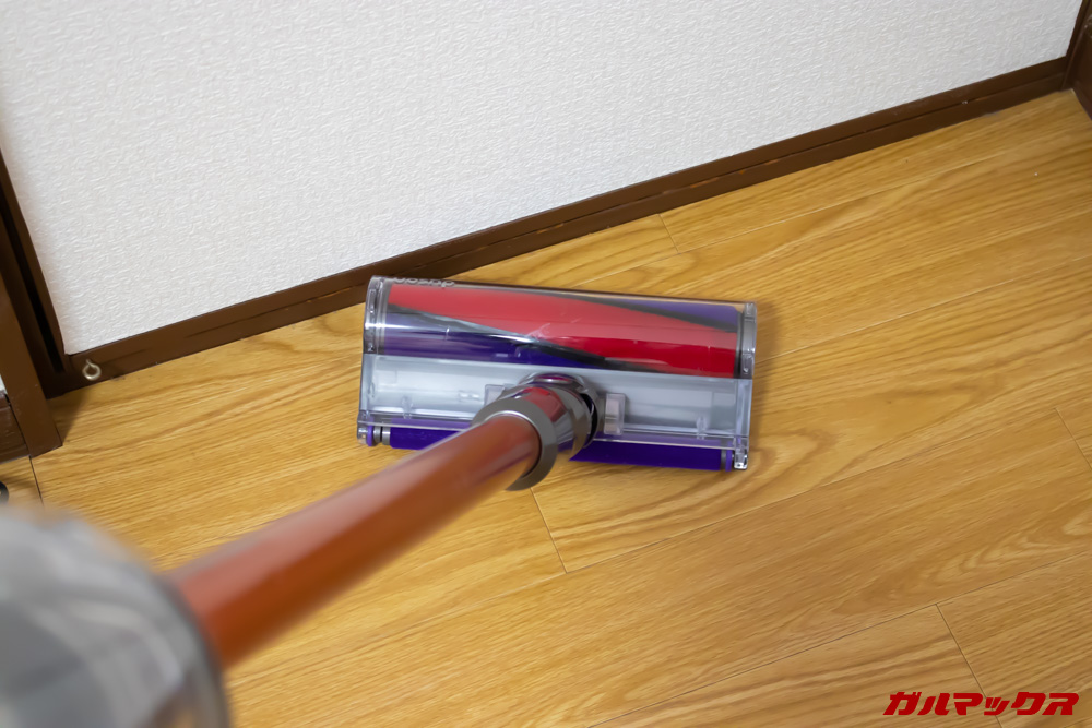 ▼Dyson Cyclone V10 Fluffy SV12 FFのヘッド先端ですが、取っ手部分が接地するまで寝かせてもセット先端が浮きません。↓