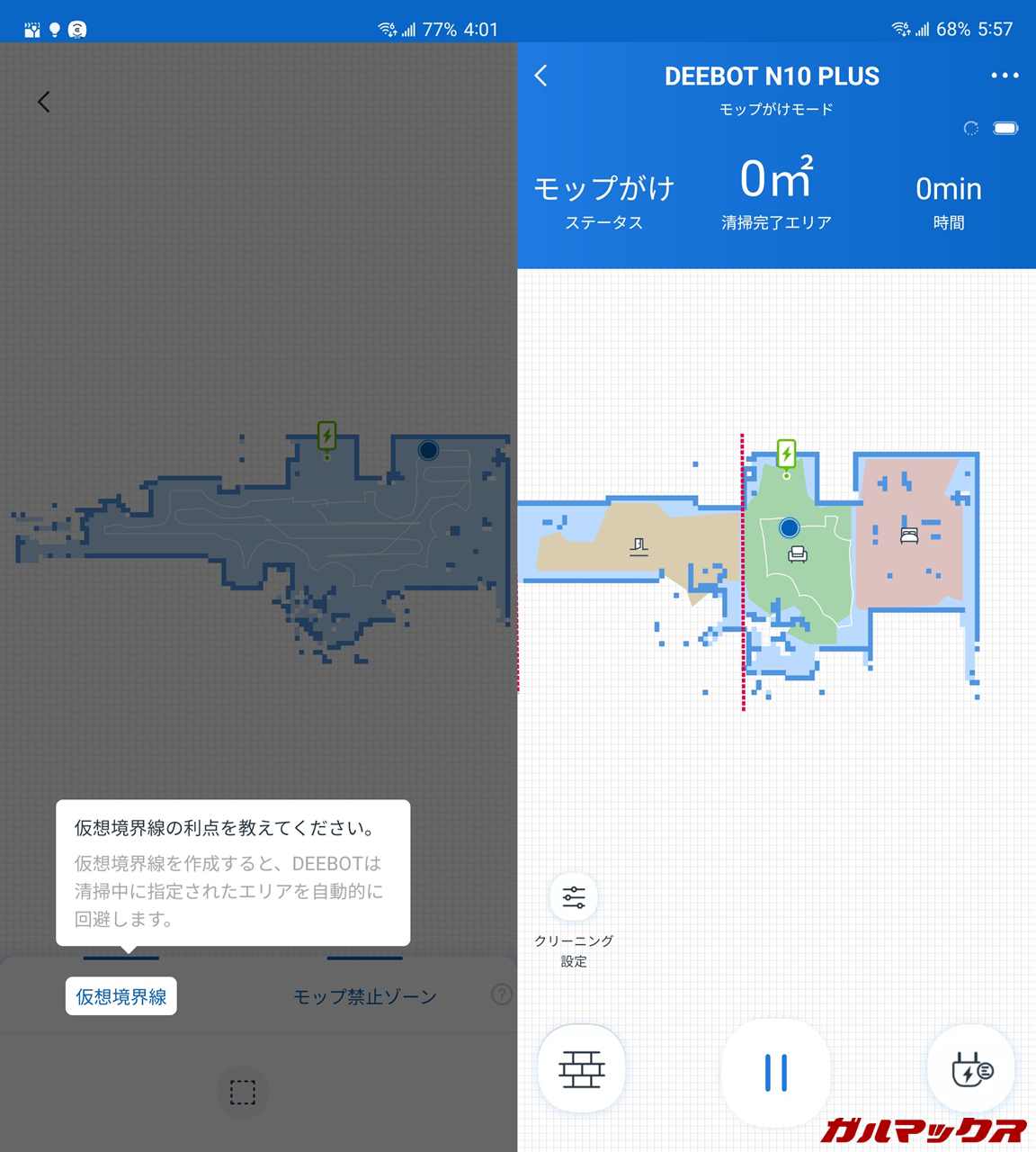▼禁止ゾーン設定ももちろん対応。マッピング機能がないやつだと進入禁止のテープを貼らなければいけないんですがDEEBOT N10 PLUSはアプリ側の設定だけでOKでした。↓
