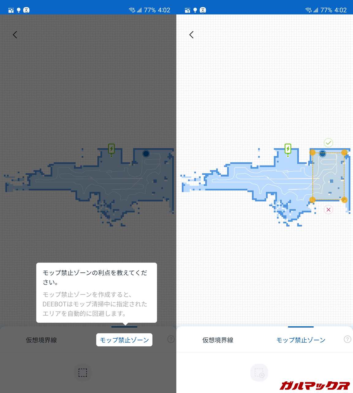 ▼水濡れがだめな場所ではモップでの水拭きモードの時だけ回避する設定もできました。畳やカーペットの場所に割り当てておけば安心。↓