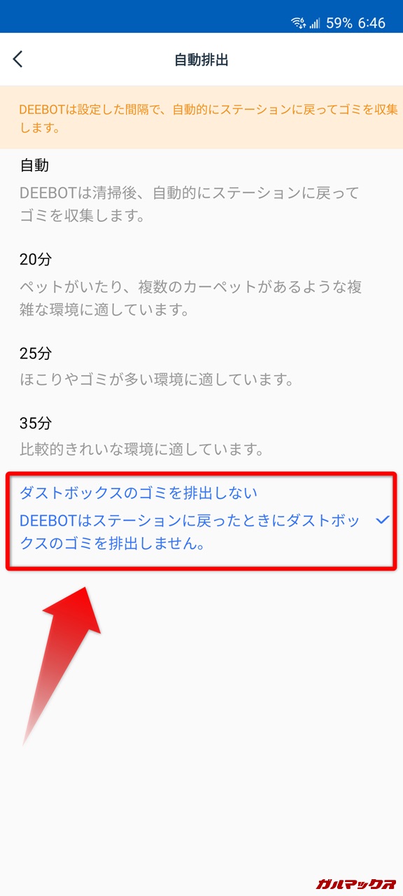 デフォルト設定だと清掃完了時に毎回ステーションのダストボックスにロボット掃除機に溜まったゴミを送り込みます。
