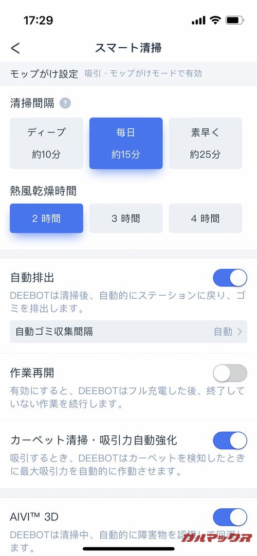 ▼モップの乾燥は2時間、3時間、4時間と分かれていますが、水量「低」なら2時間でカラッカラになってました。乾燥時間はアプリから切り替えられるので、短時間から試してみて乾いてなければ時間を増やす感じでの調整がオススメです。↓