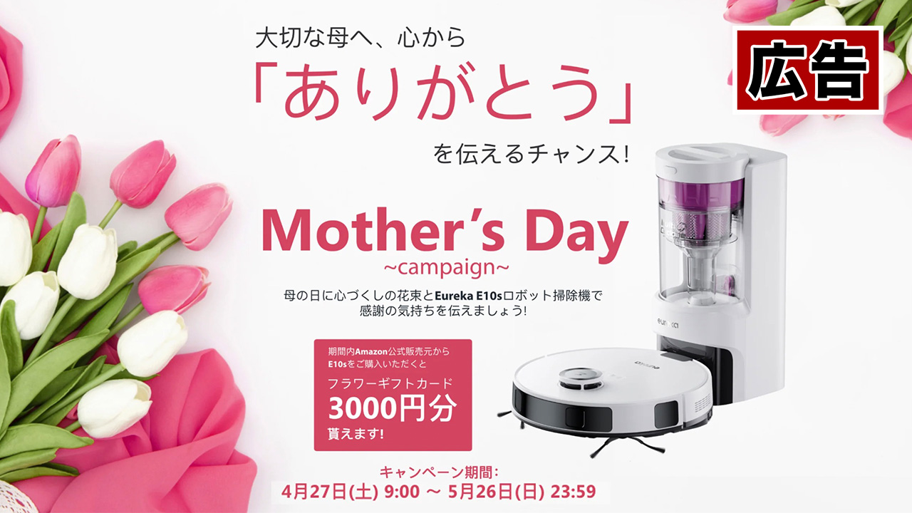アメリカ ニュー・ジャージー州に拠点をおく掃除機メーカーのEurekaが母の日プレゼントキャンペーンを開催中。5月26日23時59分までロボット掃除機「EUREKA E10s」を購入すると先着で3,000円分のフラワーギフトカードが貰える。