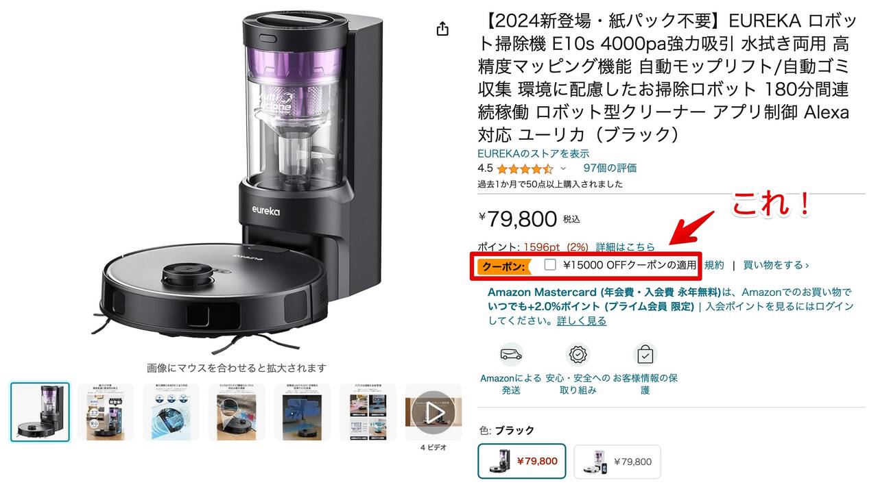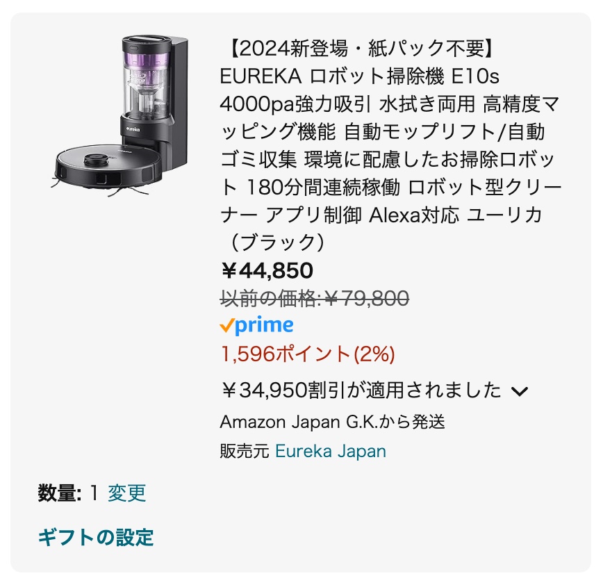 Eureka E10sの通常価格は79,800円ですが、Amazon最大のセール「Prime Day」に先駆けた先行セールにて、なんと44,850円までお安くなっています。割引は2024年7月10日まで。過去最安値なのでお見逃し無く!