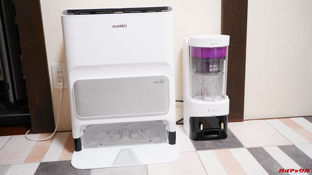 ▼ゴミ自動収集、モップ用の水タンク補充、モップ洗浄、モップ乾燥までしてくれるタイプなのでステーションは結構大きめ。Eureka E10sと並べるとこんな感じ。↓
