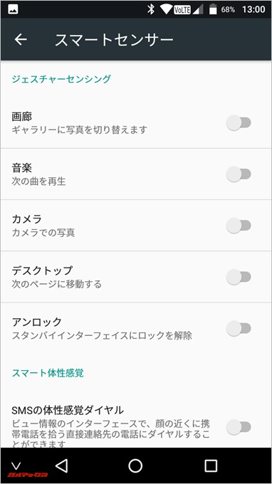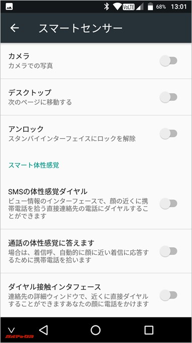 ▼こちらが「スマートセンサー」という項目。例えば「画廊 ギャラリーに写真を切り替えます」と書かれている項目はオンにしたところで、どの様に機能を利用して良いのかサッパリ分からない。↓