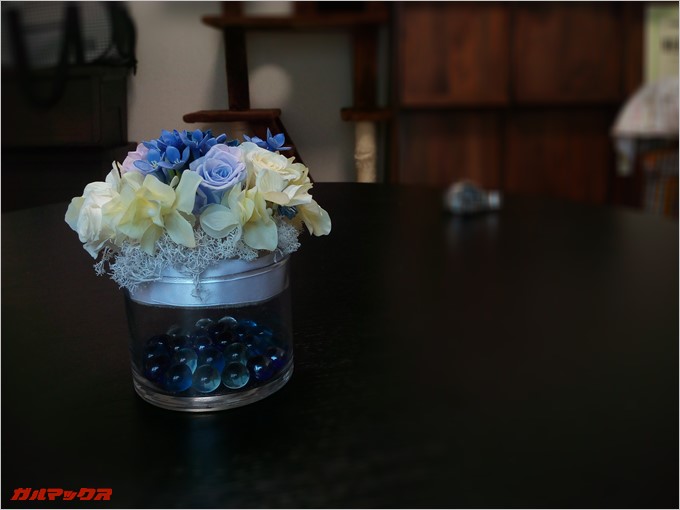 ▼ちなみに疑似的なボケ味撮影ですが、被写体の位置を調整するとそれなりの写真が撮影可能です。左がボケていない写真で右がボケ味MAX。(写真の真ん中のバーは動かせます)↓