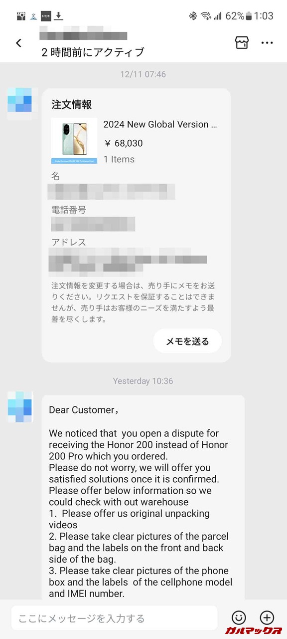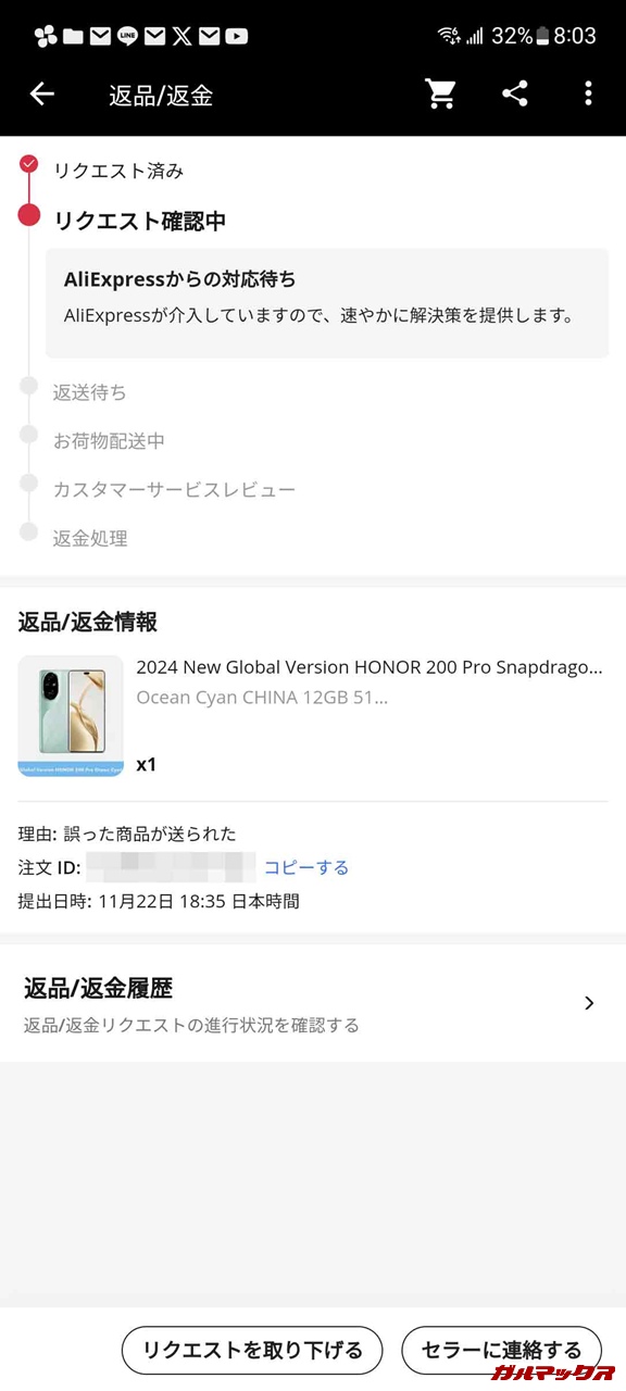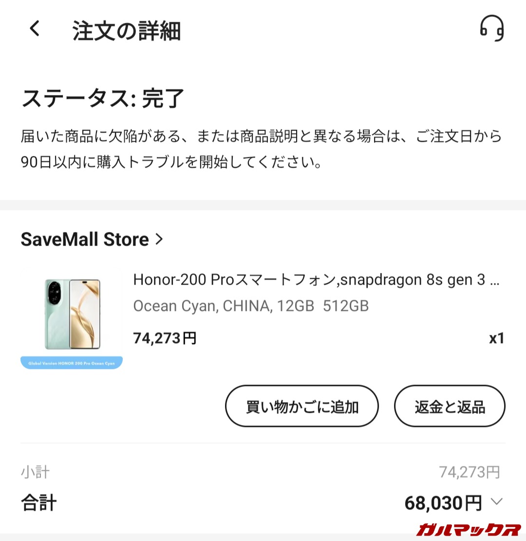 今回のHONOR 200の件より前にもGalaxy S21 Ultraを注文したら違う色が届いた上に、新品と謳っておきながら実際リファービッシュ品で画面がおかしい個体をつかまされたこともあり、キレてゴネまくったら全額返金してもらったこともあったり。