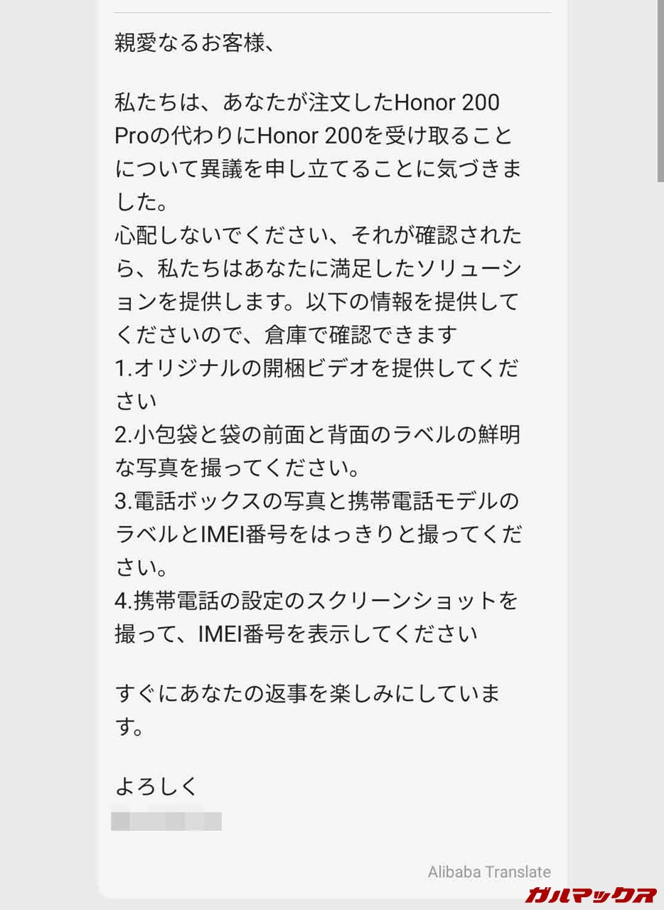 ▼今回筆者はHONOR 200 Proを注文しましたが、届いたのは下位のベースグレードのHONOR 200。つまり別のものが届いてしまいました。なので問い合わせへ。↓