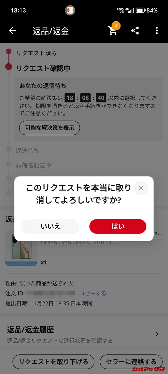 ▼もしショップからの提案で同意するんであれば、返金要求を取り下げておきましょう。その後、取り下げた旨のメッセージを送って返金してもらえればOK。その際、いつごろ返金されるかの日時も伝えてくれることもあります。↓