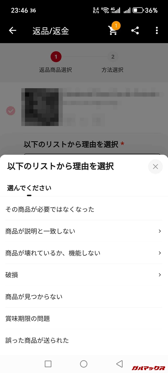▼理由を選択する画面が出てくるんで選択。今回は違うスマホが届いたんで誤った商品が送られたを選びました。↓