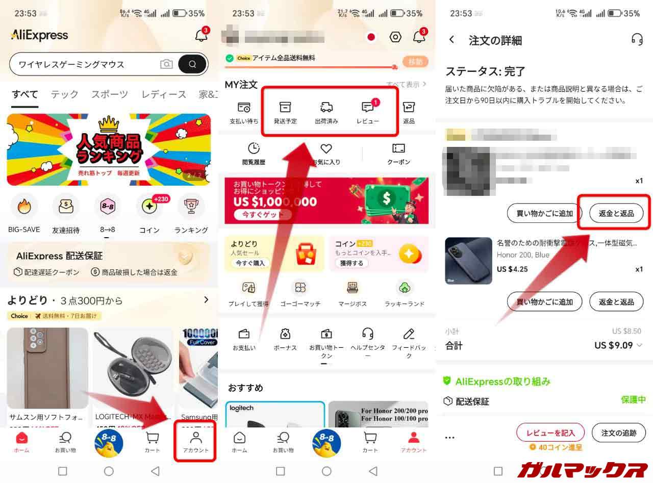 - AliExpressアプリの「アカウント」→「My注文(My Orders)」→「当該製品を選択」→「返金と返品」を選ぶ