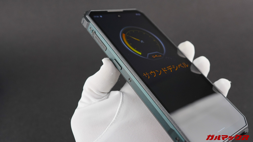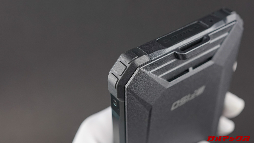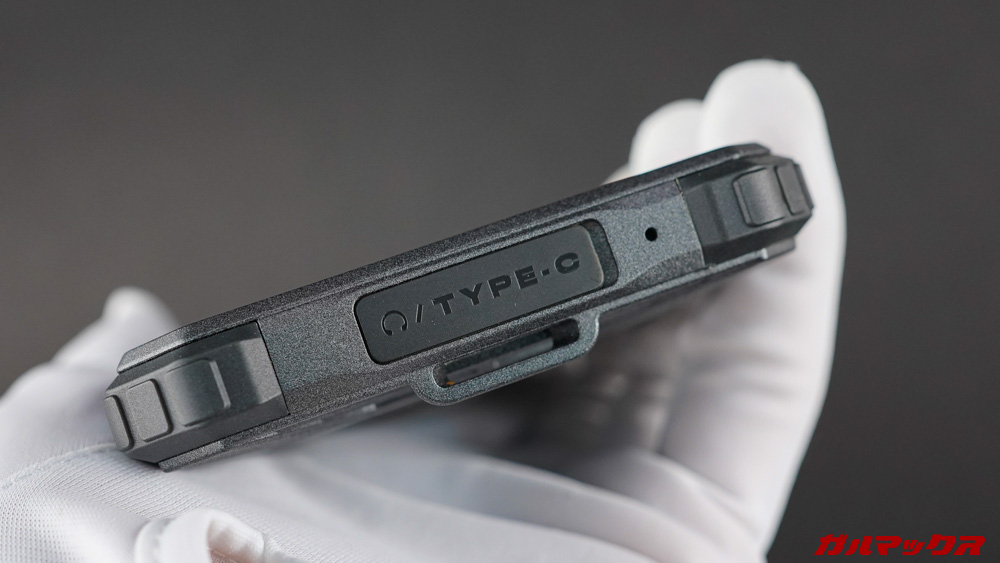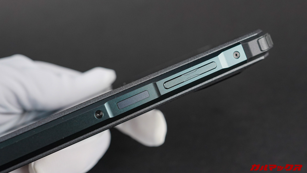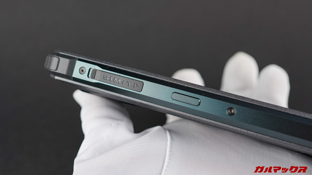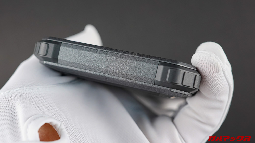 ▼ボタンは一般的なスマホの配置と同じ。ポート類およびSIMスロットはキャップで覆われています。このボタンの押し心地、すごく好き。カチカチっと確実な手応えを感じられます。↓