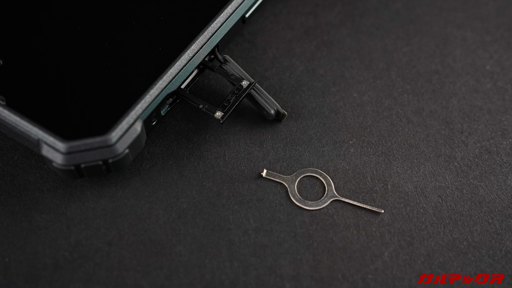 ▼この特殊なSIMピンは紛失したらヤバイんで注意っす。何がヤバイっていうとSIMトレイの開閉ができなくなっちゃうんすよ。ピンの逆側がちょっとしたフック形状になってて、それを使ってキャップを開けたりトレイを引き出すんです。↓